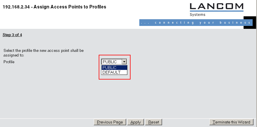 2. Click on the link to start the wizard. Select the desired access point by means of its MAC address and choose the WLAN configuration that is to be assigned to the access point.