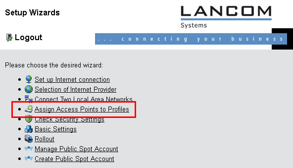 1. Open the configuration of the LANCOM WLAN controller in WEBconfig. Click on Setup Wizards and select the wizard Assign access points to profiles.