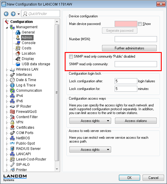 In LANconfig, the setting for the SNMP read-only community 'Public' is to be found under Management > Admin.