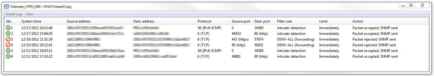 Via Device > View firewall event log you can view the firewall events for a selected device. The firewall events show the last 100 actions of the firewall with the following details: