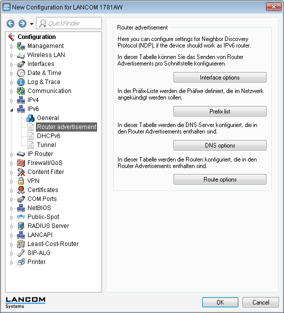 The Router advertisement configuration provides you with four buttons for setting up the Neighbor Discovery Protocol (NDP) if the device is to operate as an IPv6 router: