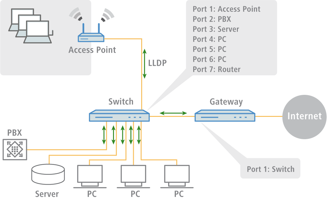 The data packets being sent and received contain information such as the name and the description of the device, the ID and description of ports, the IP address or MAC address of the device, the specific capabilities of the device (e.g., in terms of switching and routing), VLAN identifiers and vendor-specific details. In this case, LLDP defines basic information that a data packet must always include, as well as optional additional information.