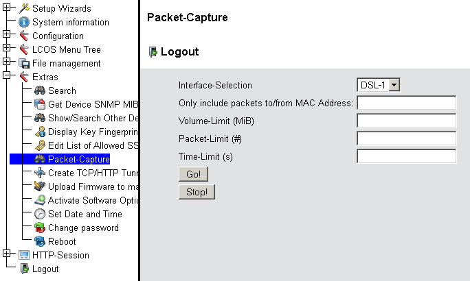 Click on Go! to start the recording process. After a certain period of time (depending on the connection speed), a window opens for you to save the generated files. You can now save the file locally with the suffix .cap. By default, the file name is composed of the description and interface associated with the device for which the data packets were recorded (e.g. LCWLC-4025-LAN-2.cap). You can change the name when saving or later.