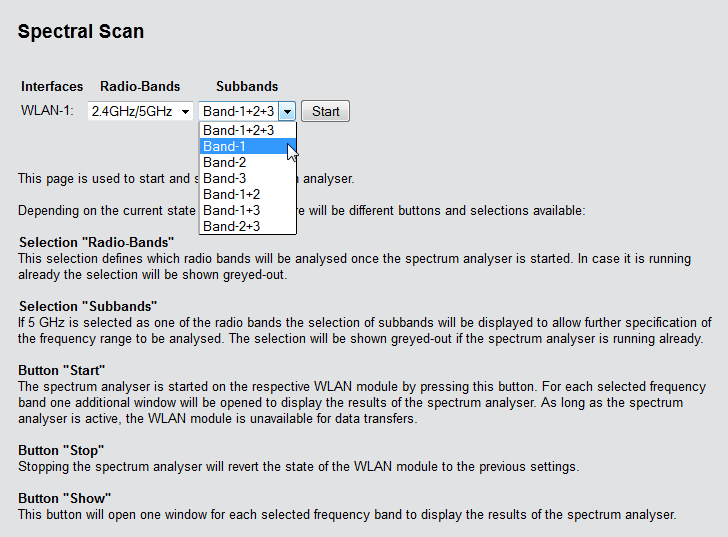 - Start: Clicking this button starts the spectral scan on the relevant WLAN module. A separate window opens for each of the selected frequency bands.