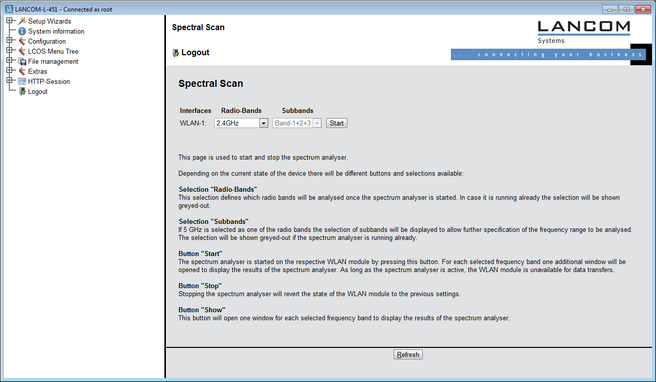 - Stop: This buttons ends the analysis. The WLAN module then returns to the previous mode and is available again with its usual functionality. Anmerkung: This button is only shown once the module has been started.