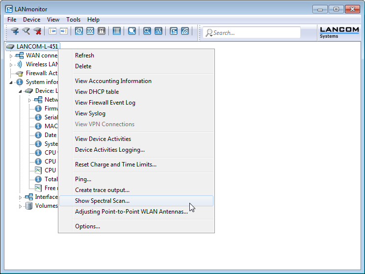 The spectral scan can also be started from the LANmonitor. To do this, right-click the relevant device in the list and select Show spectral scan in the context dialog.