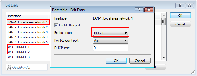 2. Assign the logical LAN interface 'LAN-1' and the WLC tunnels 'WLC-tunnel-1' and 'WLC-tunnel-2' to the bridge-group 'BRG-1'. Make sure that the other LAN ports are not assigned to the same bridge group. In LANconfig you find these settings under Configuration > Interfaces > LAN > Port table.