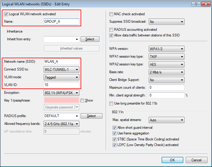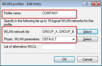 3. Create a WLAN profile and give it a suitable name. Then assign the logical WLAN networks and the physical WLAN parameters created previously to this WLAN profile. In LANconfig you find these settings under Configuration > WLAN Controller > Profiles > WLAN profiles.