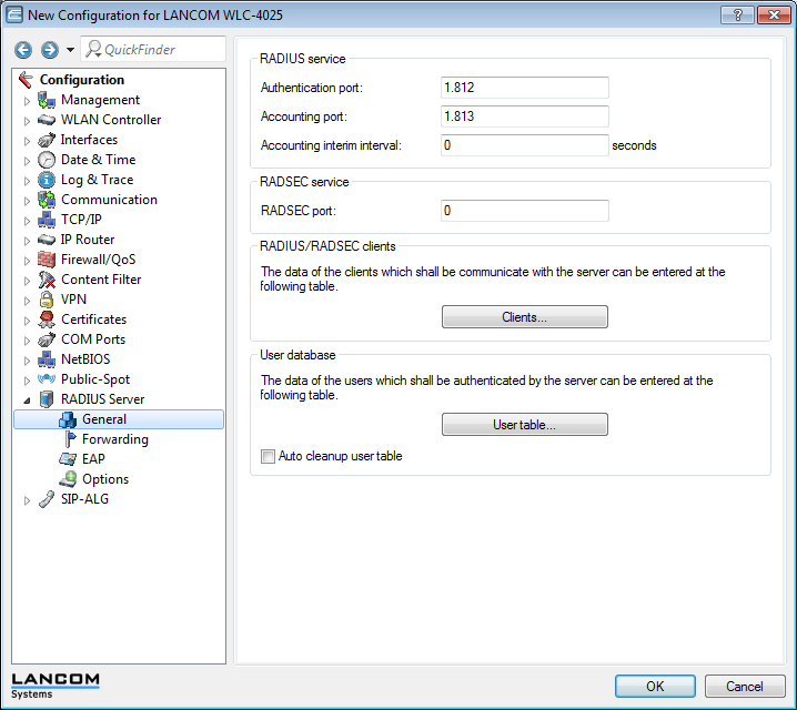 As of LCOS version 7.70, the Wizard stores the Public Spot access accounts in the user database of the internal RADIUS server. In order to use Public Spot access accounts, you must configure the RADIUS server and the Public Spot module to use the RADIUS server.