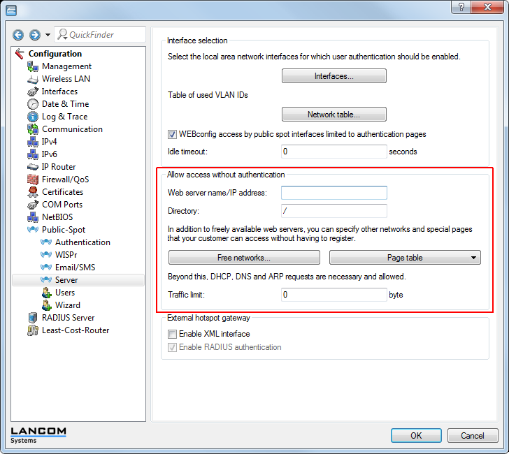 - Page tableEnter the addresses (URLs) of the web pages to be displayed to users on the Public Spot in case of login, error, status display, etc. Read the chapter about Default and customized authentication pages.