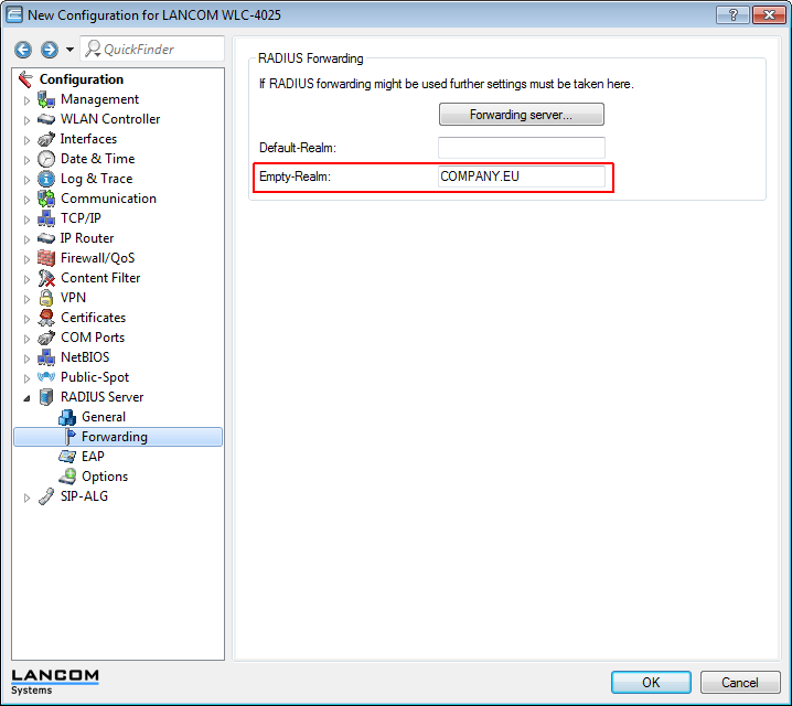 2. In the WLAN controller's RADIUS server, define an "empty realm" (e.g., "COMPANY.EU").
