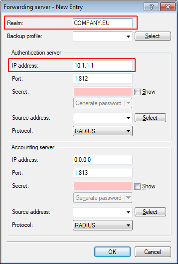 All incoming RADIUS requests which have the realm "COMPANY.EU" will be forwarded to the specified IP address.