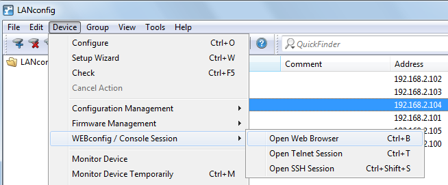 Note: Under Tools > Options > Extras > Browser used to display WEBconfig, you choose whether LANconfig should use the system default browser or its own internal browser.