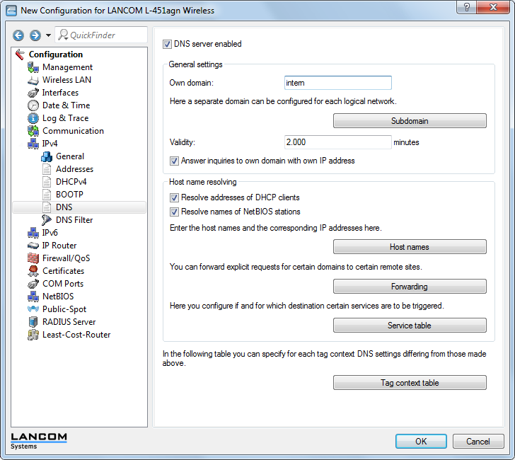 It is possible to define tag contexts in LANconfig under , which override the global settings of the DNS server for specific interface and routing tags (routing context):