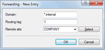 For DNS forwarding, multiple independent forwarding definitions (especially general wildcard definitions with "*") are possible for DNS forwarding by identifying them with unique routing tags. Depending on the routing context of the requesting client, the router considers only the forwarding entries that are identified accordingly and the general entries marked with "0".