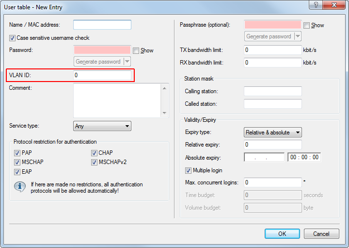 Regardless of the assignment of a VLAN ID for the entire Public Spot module, the device offers you the option of separately assigning individual VLAN IDs for individual Public Spot users. This ID is automatically assigned by the RADIUS server to your users after successful authentication. In this way it is possible, for example, to classify different Public Spot users in separate networks with different access rights and access options without having them login to separate SSIDs or requiring you to publicize the availability of various networks (e.g., networks for different customer types). The relevant rules can be realized via the firewall by specifying the VLAN ID of the respective user/the relevant user groups as the source tag.