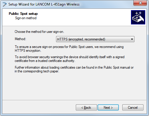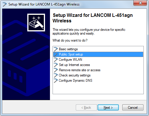 2. Start the Setup Wizard with Device > Setup wizard, select the action Setup Public Spot and then click Next.