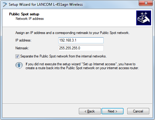 If you want to separate the Public Spot network from internal networks for security reasons, make sure that the corresponding option is enabled.