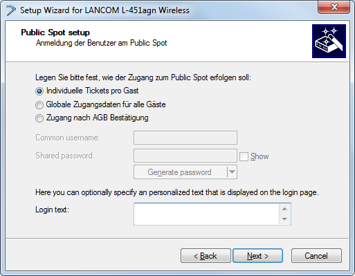 6. Specify which login data your users are to use to login to the Public Spot. Also, you can optionally add customized text to the login page. To continue, click on Next.