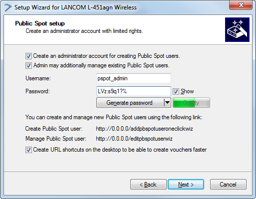 Using the user creation wizard Create Public Spot account, the administrator has the option of creating time-limited accounts for Public Spot users and print the corresponding login data on a voucher.