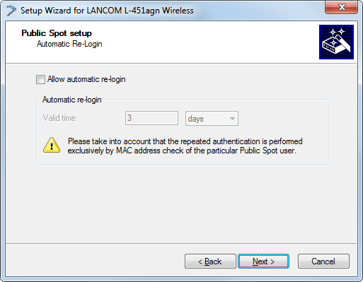 The Automatic re-login option is a convenience option that allows the Public Spot to automatically authenticate known users or devices. However, if known devices are to be recognized exclusively from the MAC address of the network adapter, the fact that MAC addresses can be falsified represents a potential security risk. For this reason this option is disabled by default.