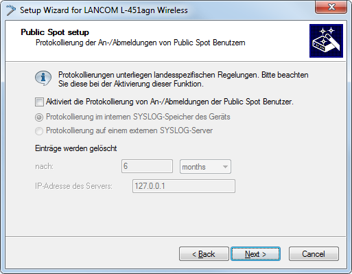 10. If needed, enable logging of logins and logouts for Public Spot users in the internal SYSLOG storage of your device. To continue, click on Next.