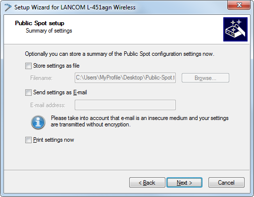 12. The click Next and finally Finish to complete the basic installation of the Public Spot. The Setup Wizard will now send the settings to the device.