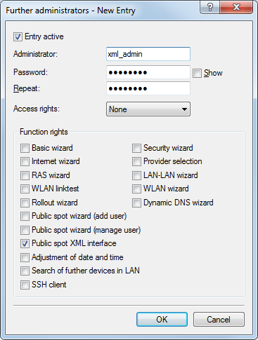Note: The new administrator should not have any further Public Spot function rights, since they represent a potential security risk in combination with the XML interface (e.g., if the communication between XML sender and device is unencrypted).