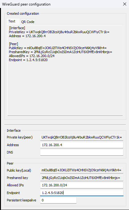 Using the displayed QR code, you can import the configuration into a WireGuard app. Open the WireGuard app and add a new peer via QR code. Additional parameters can then be modified or added if necessary.