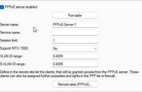 Under Server name, assign a name to the PPPoE server. This name is displayed to the PPPoE clients
