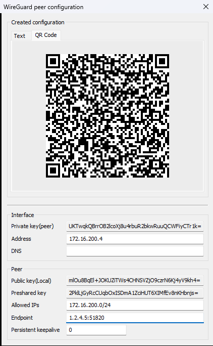 Using the displayed QR code, you can import the configuration into a WireGuard app. Open the WireGuard app and add a new peer via QR code. Additional parameters can then be modified or added if necessary.