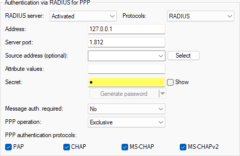 the internal RADIUS server is to be used, 127.0.0.1 can be entered as the IP address. |