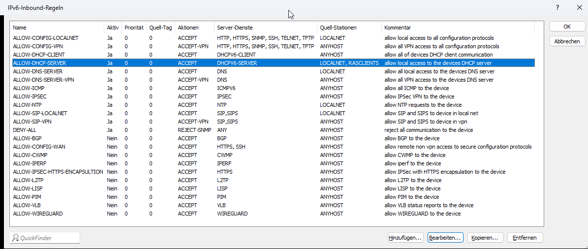 7. Überprüfen Sie in den IPv6-Inbound-Regeln, dass "Allow-DHCP-Server" von den Quellstationen "RASCLIENTS" erlaubt ist. Außerdem muss "Allow-DNS-Server" muss von den Quellstationen "RASCLIENTS" erlaubt sein, wenn der LANCOM Router selbst IPv6-DNS-Server für die PPPoE-Clients sein soll.
