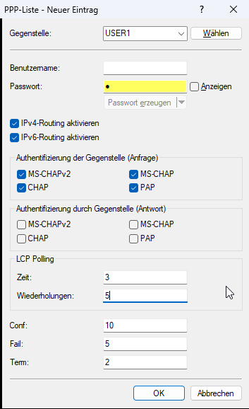 2. Das Feld Benutzername wird für PPP-Einwahl in der Rolle als PPPoE-Server im LCOS nicht verwendet und muss daher hier leer gelassen werden.