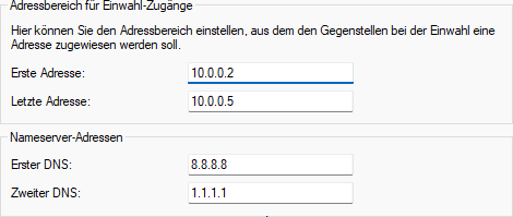 Erste Adresse Erste IPv4-Adresse des Einwahlpools, z. B. 10.0.0.2.