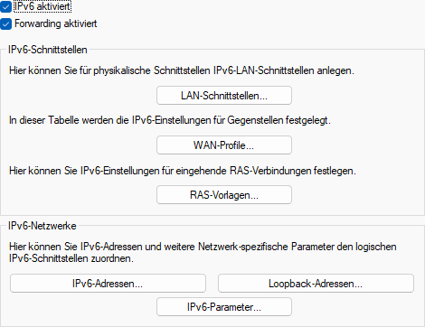 3. Legen Sie unter IPv6 > Router Advertisements > Präfix-Pools einen neuen Tabelleneintrag an. Wählen Sie als Interface-Name das "RAS-Template" und als Erstes Präfix geben Sie das erste IPv6-Präfix des Pools an, dass Clients zugewiesen werden soll. Als Letztes Präfix geben Sie das letzte IPv6-Präfix des Pools an, dass Clients zugewiesen werden soll. Die Präfix-Länge muss exakt /64 sein.