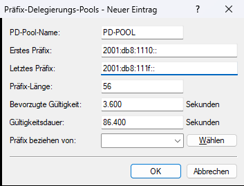 4. Legen Sie unter IPv6 > DHCPv6 > DHCPv6-Server > Präfix-Delegierungs-Pools einen neuen Tabelleneintrag an. Wählen Sie als PD-Pool-Name den Namen "PD-POOL" und als Erstes Präfix geben Sie das erste IPv6-Präfix des PD-Pools an, dass Clients zugewiesen werden soll. Als Letztes Präfix geben Sie das letzte IPv6-Präfix des PD-Pools an, dass Clients zugewiesen werden soll. Unter Präfix-Länge konfigurieren Sie die Präfix-Länge des DHCpv6-Präfixes, die einem Client zugewiesen werden soll. In der Regel wird /56 als Präfix-Länge verwendet.