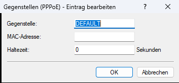 3. Setzen Sie die Haltezeit auf 0. Damit baut der PPPoE-Client die Verbindung aktiv auf, der Server baut diese nicht aktiv ab, außer bei einem LCP-Polling-Timeout