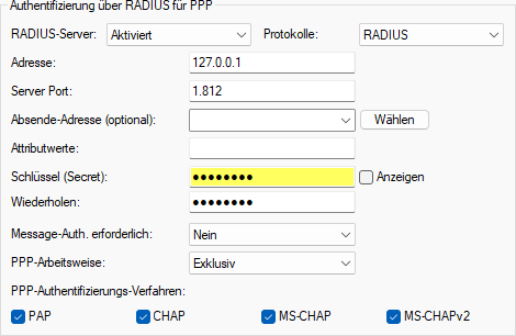 PPP-Arbeitsweise Exklusiv. Dies bedeutet, dass exklusiv der RADIUS-Server für Authentifizierung verwendet werden soll und nicht zusätzlich die interne PPP-Benutzer-Tabelle.