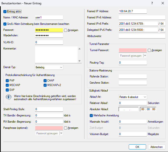 11. Legen Sie im RADIUS-Server unter RADIUS > Server > Benutzer-Datenbank > Benutzerkonten einen neuen Benutzer mit den folgenden Attributen an: