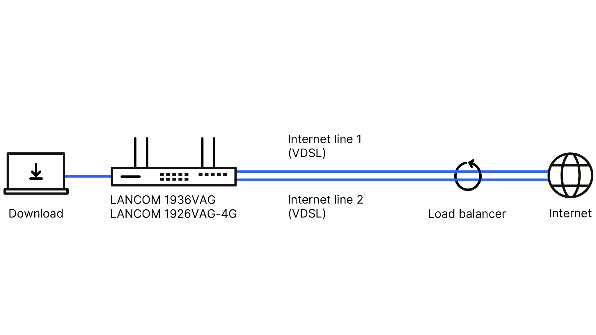 Several clients are connected to the Internet via the multi-WAN SD-WAN gateway and VDSL Supervectoring. Now, for example, two clients with a load balancer integrated in the router can work in parallel, each with a download speed of 300 Mbps, as this enables the data load to be distributed across both Internet lines. This enables a maximum load of 600 Mbps to be achieved, resulting in an enormous increase in network efficiency.