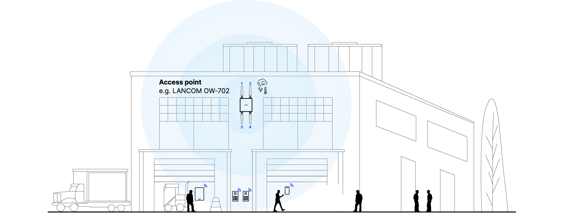 In large outdoor areas such as logistics sites, depots, or industrial facilities, the focus is often on providing targeted coverage for specific zones—such as loading zones, driveways, or storage areas. In such scenarios, the LANCOM OW-702 can be used with optionally available sector antennas to direct the Wi-Fi signal specifically in a defined direction. The directional radiation concentrates the available transmit power on the relevant area, enabling greater coverage along work and traffic zones. At the same time, radio radiation is reduced in less relevant areas. This creates a stable Wi-Fi infrastructure for mobile scanners, vehicles, machines, or industrial IoT devices—even in large and complex outdoor areas.
